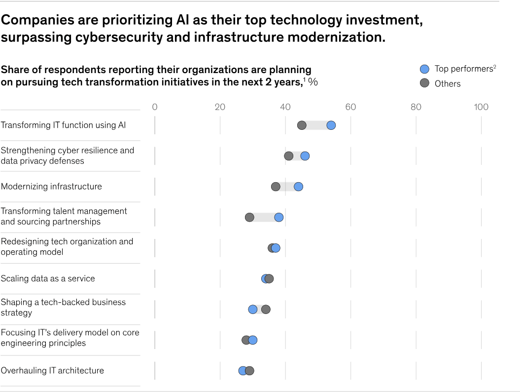 L’intelligenza artificiale è oggi la priorità assoluta di investimento. Ha superato cybersecurity e modernizzazione infrastrutturale come area di spesa principale per i prossimi due anni. Il 50% delle aziende la indica come priorità, percentuale che sale al 54% tra i top performer.