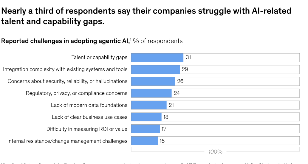 Nonostante l’entusiasmo, il percorso è tutt’altro che lineare. Un quarto delle aziende top performer dichiara di non avere ancora basi dati sufficientemente solide per scalare in sicurezza l’AI agentica. Quasi un terzo segnala gap di competenze e difficoltà di integrazione con i sistemi esistenti.