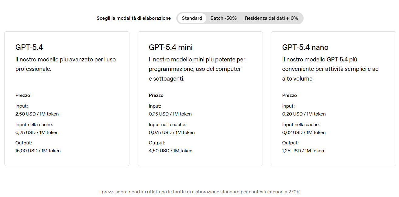 OpenAI quota oggi GPT-5.4 a 2,5 dollari per milione di token in input e 15 dollari in output; GPT-5.4 mini scende a 0,75 e 4,5 dollari, GPT-5.4 nano a 0,2 e 1,25 dollari. Anthropic quota Claude Sonnet 4.6 a 3 e 15 dollari; Haiku 4.5 a 1 e 5; Opus 4.6 a 5 e 25.