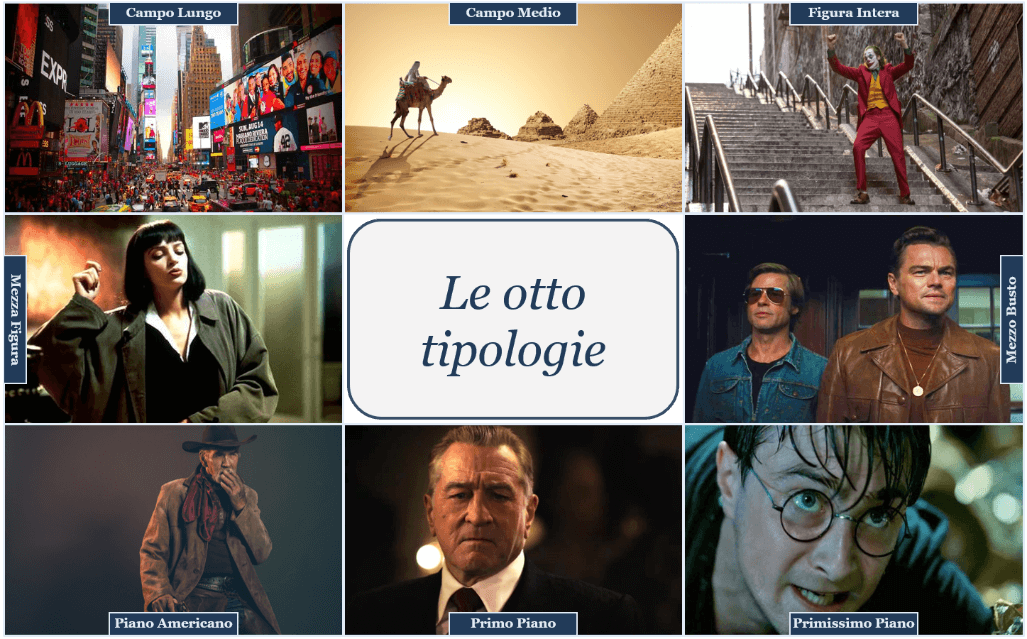 Figura 1: Otto tipologie di inquadrature cinematografiche elementari presenti nella letteratura internazionale: Campo lungo [7] (lunga distanza, prevalenza del background, figura assente o molto in lontananza), campo medio (distanza media, l’ambiente prevale, figura più ravvicinata, azioni riconoscibili), mezza figura (figura umana dalla vita in su, focus sia sul viso che sui gesti), mezzo busto (figura tagliata all’altezza del petto, volto posto più in risalto), figura intera (personaggio inquadrato per intero sulla verticale dell’immagine, focus sulle azioni compiute), piano americano (figura tagliata alle ginocchia, denota dinamicità, molto usata nei film western per mostrare l’estrazione della pistola), primo piano (inquadratura della testa e delle spalle, focus su mimica facciale e le espressioni,) e primissimo piano (focus sul volto tra attaccatura capelli e mento), queste le otto[8] classi di inquadrature più utilizzate dai direttori di scena.