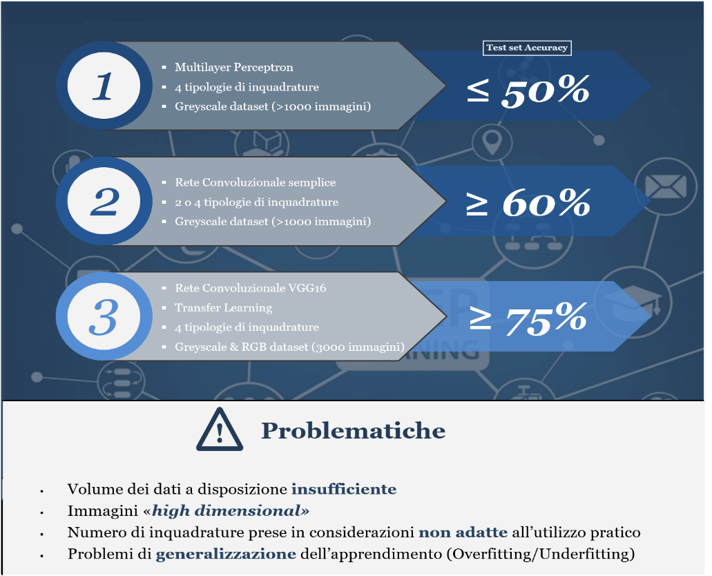 È pertanto evidente come tutti questi approcci elencati, sulla base dei risultati raggiunti, non permettono di sviluppare un tool che effettui la classificazione automatica delle inquadrature in modo efficiente e utilizzabile in ambito professionale.