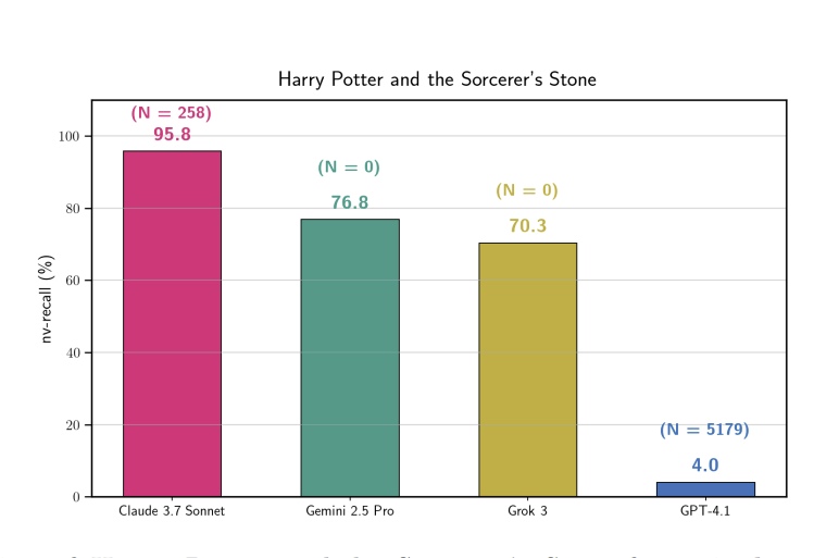 In alcuni casi, i modelli hanno restituito percentuali sorprendentemente elevate di testo corretto. Gemini 2.5 ha rigenerato il 76,8% di Harry Potter and the Philosopher’s Stone con elevata accuratezza, mentre Grok 3 ha raggiunto il 70,3%.