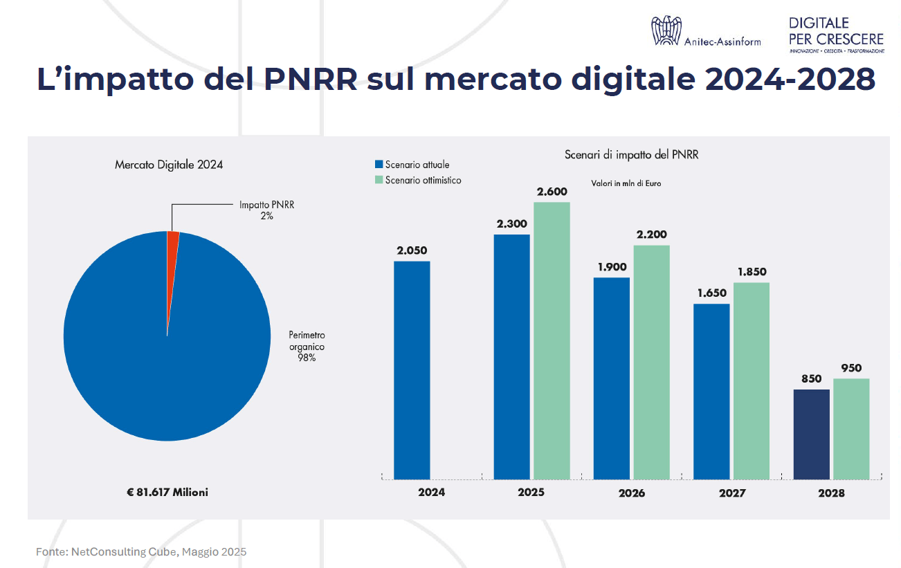 In Italia il contesto offre margini di crescita. Secondo il rapporto “Il Digitale in Italia 2025” di Anitec-Assinform, il mercato digitale ha raggiunto 84,2 miliardi di euro nel 2025 e dovrebbe arrivare a 91,4 miliardi entro il 2028, trainato da servizi ICT, software e contenuti digitali.
