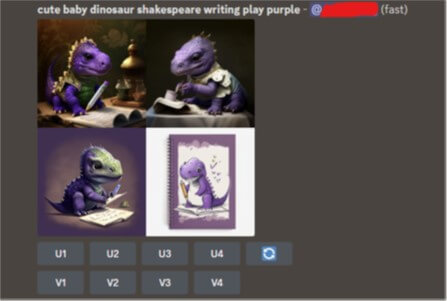 Secondo gli esempi forniti dall’USCO, inserendo il comando ”/immagina un cucciolo di dinosauro Shakespeare che scrive una commedia viola” l’AI fornisce quattro immagini diverse, comunque riferibili a cuccioli, a dinosauri, al colore viola, a Shakespeare. Le immagini hanno tuttavia caratteristiche (espressive) diverse, in quanto il cucciolo ha forme, colori, proporzioni specifiche in ciascuna delle immagini (v. sotto l’immagine tratta dalla decisione dell’USCO).