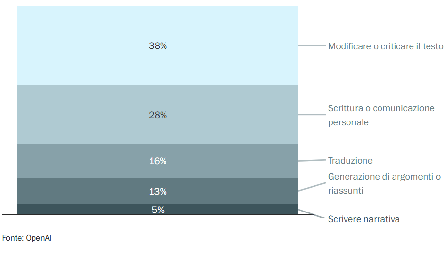 Segue la scrittura, con particolare enfasi su editing e revisione di testi (38%), comunicazione personale (16%) ed esercizi di scrittura creativa o accademica. Solo il 4,2% delle conversazioni riguarda la programmazione, pur restando una nicchia strategica per il settore tech.