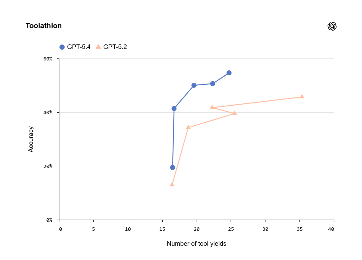 Anche nella navigazione browser le prestazioni crescono, sia su WebArena-Verified sia su Online-Mind2Web. Il dato interessante, tuttavia, non è soltanto la percentuale finale. OpenAI insiste molto sul concetto di tool yields, cioè sul numero di sospensioni necessarie per attendere gli strumenti. È un indicatore meno spettacolare ma più vicino alla produttività reale, perché cattura la latenza effettiva di workflow multi-step e la capacità del modello di parallelizzare o comprimere le operazioni.