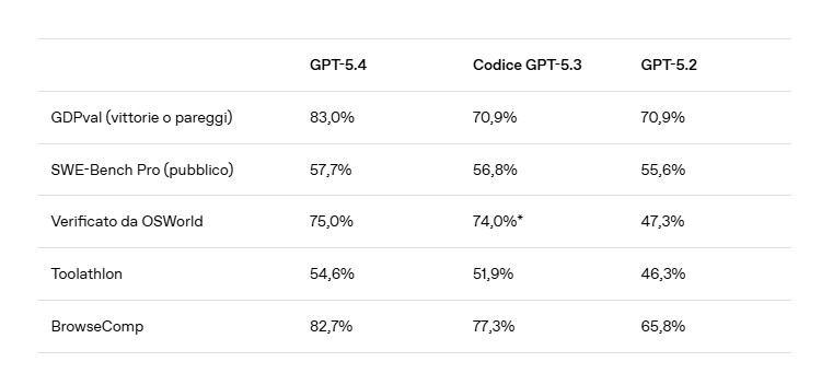I benchmark mostrano un avanzamento netto. Su OSWorld-Verified, test dedicato alla navigazione di ambienti desktop tramite screenshot e input da tastiera o mouse, GPT-5.4 raggiunge il 75,0 per cento di successo, sopra il 47,3 per cento di GPT-5.2 e leggermente oltre il riferimento umano riportato dallo stesso benchmark, pari al 72,4 per cento (vedi GPT-5.4: la nuova generazione dell’AI per il lavoro professionale – AI4Business).