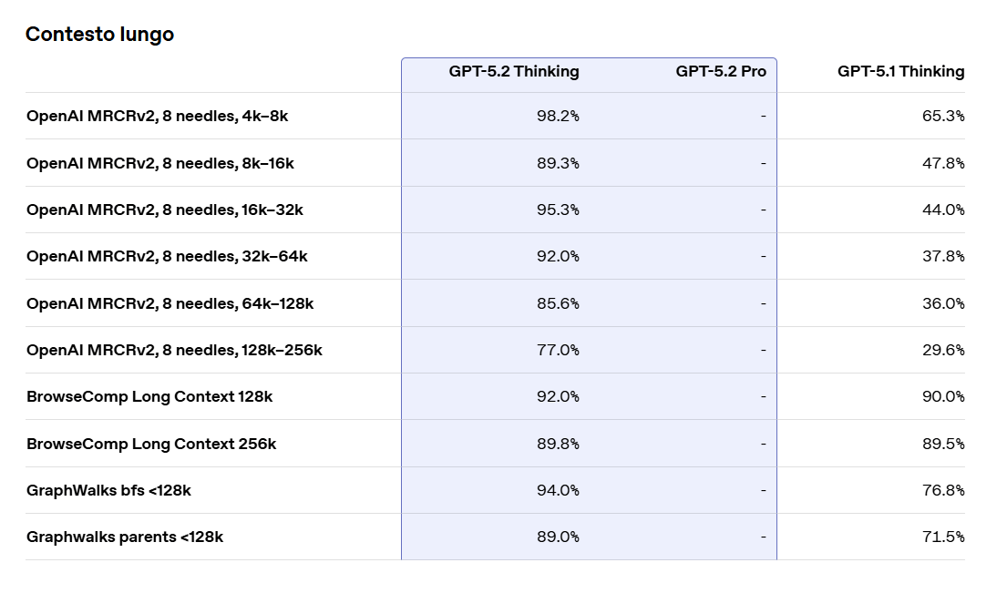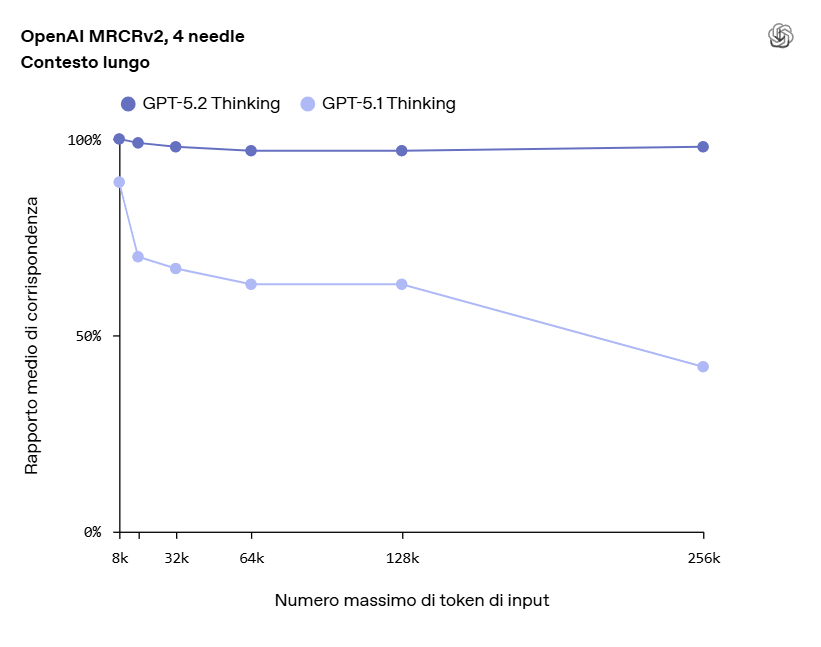 Un altro tassello, spesso sottovalutato finché non si lavora su documenti lunghi, è la tenuta sul contesto esteso. GPT-5.2 Thinking viene presentato come leader su OpenAI MRCRv2, un test pensato per verificare la capacità di integrare informazioni sparse in testi molto lunghi. OpenAI riporta che il modello arriva a quasi il 100% di accuratezza nella variante a quattro “aghi” fino a 256k token.