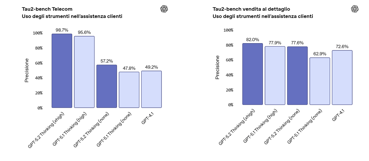 Il secondo asse, quello dell’agenticità, è probabilmente il più visibile nell’esperienza quotidiana. OpenAI dichiara un nuovo stato dell’arte su Tau2‑bench Telecom con il 98,7%. Se questo si traduce in stabilità reale, significa ridurre drasticamente i collassi degli agenti in conversazioni multi‑turno. È la differenza tra un assistente che sa chiamare un’API una volta e un sistema che può gestire una pratica completa, mantenendo vincoli, preferenze, eccezioni e passaggi obbligati.