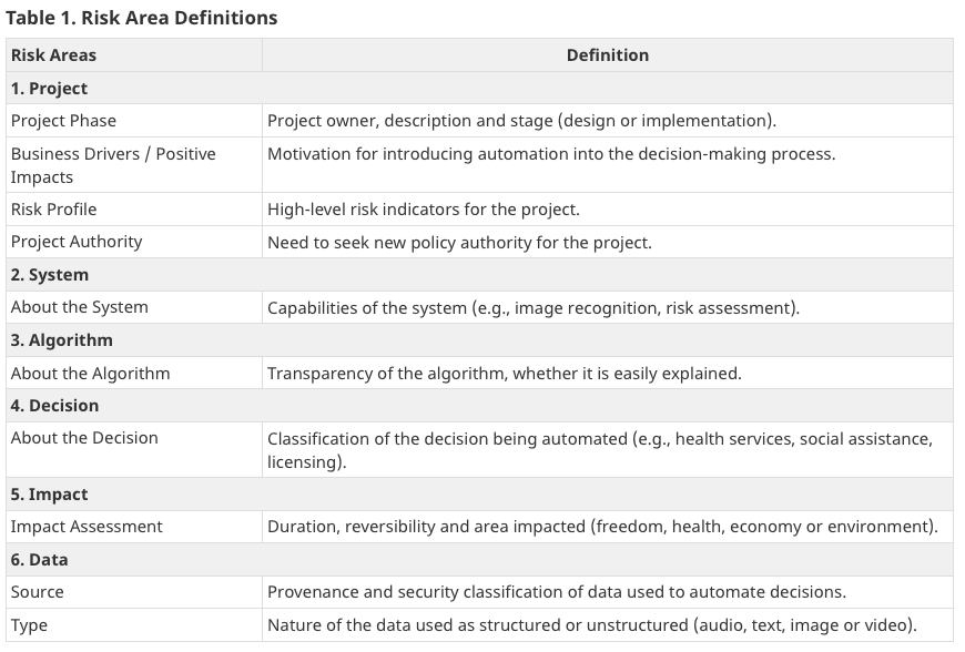 AIA, inoltre, è composta da differenti domande finalizzate a valutare le aree di rischio, suddivise in progettazione, algoritmo, tipo di decisione, impatto e dati e definite specificamente nella tabella 1.