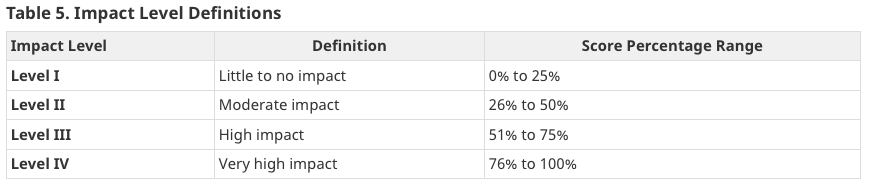 I citati livelli spaziano da ‘nessun impatto o basso impatto’, a ‘impatto moderato’, ad ‘alto impatto’ fino a ‘altissimo impatto’. Si noti che il livello di impatto è determinato dalla percentuale del punteggio di ‘compliance reale’ rispetto al massimo punteggio di impatto grezzo raggiungibile.