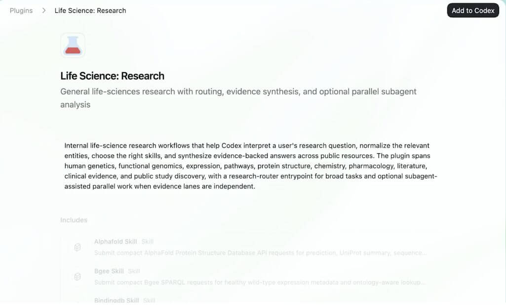 Un elemento centrale del progetto è il plugin per le scienze della vita sviluppato per Codex. Il pacchetto consente di collegare il modello a oltre 50 database e strumenti scientifici pubblici.