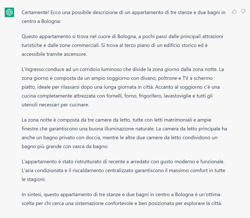 “Scrivimi la descrizione di un appartamento di tre stanze e due bagni in centro a Bologna”