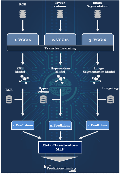 Oltre all’addestramento delle tre reti tramite transfer learning, questo approccio prevede una fase in cui vengono fornite alle VGG16 altri tre campioni di dati mai processati e non facenti parte dei dataset iniziali di training, su cui queste effettueranno contemporaneamente le predizioni di classificazione, ognuna sulla corretta versione dell’immagine su cui era stata addestrata. L’insieme di queste predizioni per ogni immagine costituiranno il set di addestramento del meta classificatore che, ricombinando queste informazioni (tre predizioni per ogni immagine), permette di migliorare l’accuracy e a stabilizzare il training, evitando qualsiasi problema di generalizzazione di apprendimento che lo renderebbe inutilizzabile.