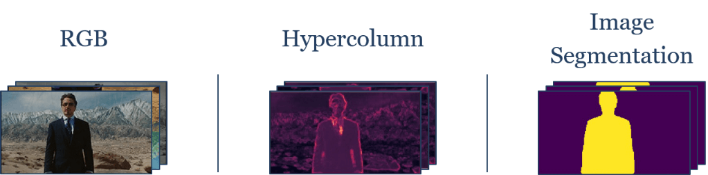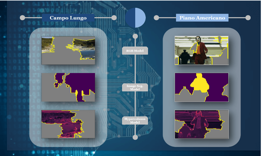 I restanti set sono invece derivanti da Deep Learning transformation ad hoc effettuate sullo stesso primo campione di immagini RGB e quindi presentano la stessa cardinalità e lo stesso preprocessing all’interno della loro pipeline di utilizzo. Le trasformazioni implementate (Hypercolumn extraction[7], Semantic image segmentation[8]) hanno la finalità non solo di aumentare di tre volte il campione totale di dati adoperati (tre dataset da 9mila campioni contenenti ognuno una versione della stessa immagine per un totale di oltre 27mila inquadrature) e quindi effettuare una Data Augmentation[9] che permetta di superare i problemi di overfitting, ma anche di avere campioni che mettano in risalto le feature fondamentali delle inquadrature (ipercolonne) o che semplifichino le immagini (dati high dimensional) e riducano il “rumore di fondo” (segmentazione), ponendo in primo piano gli elementi più utili a fornire la giusta classificazione di un’immagine in una classe di inquadratura (e.g. una figura umana ben delineata porta l’algoritmo a classificarla all’interno di una delle classi in cui è presente in primo piano).