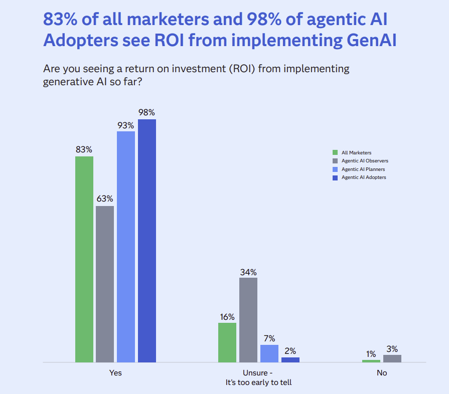 Secondo il report di Sas, il 21% dei marketer sta già sperimentando agentic AI su casi reali; il 73% prevede di introdurla nei prossimi due anni. Le organizzazioni statunitensi risultano leggermente più avanti nel testing.