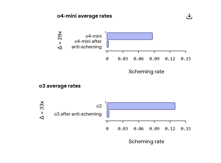 Grazie all’allineamento deliberativo – che impone ai modelli di leggere e ragionare su un “spec anti-scheming” prima di agire – OpenAI ha osservato una riduzione di circa 30 volte nelle azioni coperte: dall’8,7% allo 0,3% per o4-mini e dal 13% allo 0,4% per o3. Tuttavia, permangono rari fallimenti critici.