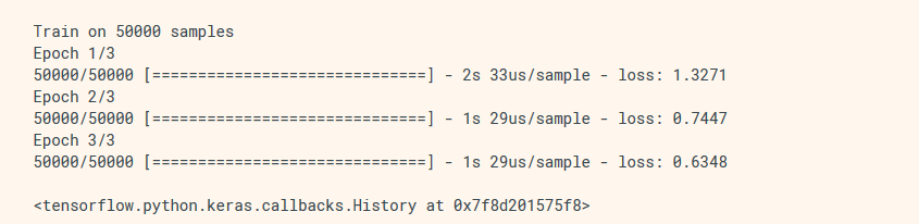 Abbiamo citato in precedenza l’ottimizzazione di Adam (che è un acronimo per “ADAptive Moment Estimation,” algoritmo sviluppato nel 2015), grazie alla quale miglioriamo il training. Usiamo anche opportuni parametri di drop out e iniziamo ad addestrare il modello nella pipeline di training misurando, ogni volta la probabilità d’errore del modello. Sono necessarie varie iterazioni per addestrare il nostro modello. Abbiamo scelto deliberatamente di non mostrare codice ma questo è l’output che restituisce una semplice iterazione in Tensorflow con Keras: