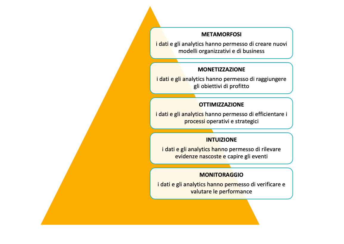 Diventare una data driven company presuppone un percorso di maturazione a step: le informazioni e gli analytics vengono utilizzati allo stadio più basico per il monitoraggio dell’esistente, quindi per l’estrazione degli insights, l’ottimizzazione dei processi aziendali, la generazione di ulteriori guadagni e infine, al livello più alto, per lo sviluppo di approcci disruptive alla gestione del business.