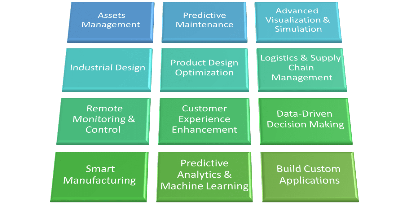 - Advanced Visualization & Simulation: sfruttando le funzionalità di visualizzazione 3D si possono simulare vari scenari in modo rapido e accurato senza dover condurre lunghi esperimenti o test in ambienti reali. Il tutto si realizza all’interno di ambienti virtuali invece che fisici, per la progettazione/test dei prodotti, per l’ottimizzazione dei processi di produzione, ecc…