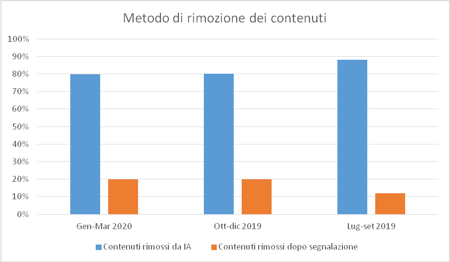 Il successo ottenuto per alcune di queste categorie è molto rilevante: ad esempio, per i post di incitamento all’odio Facebook afferma che l’88,8% di tutti i post rimossi in questo trimestre è stato rilevato dall’AI, in crescita rispetto all’80,2% del trimestre precedente.