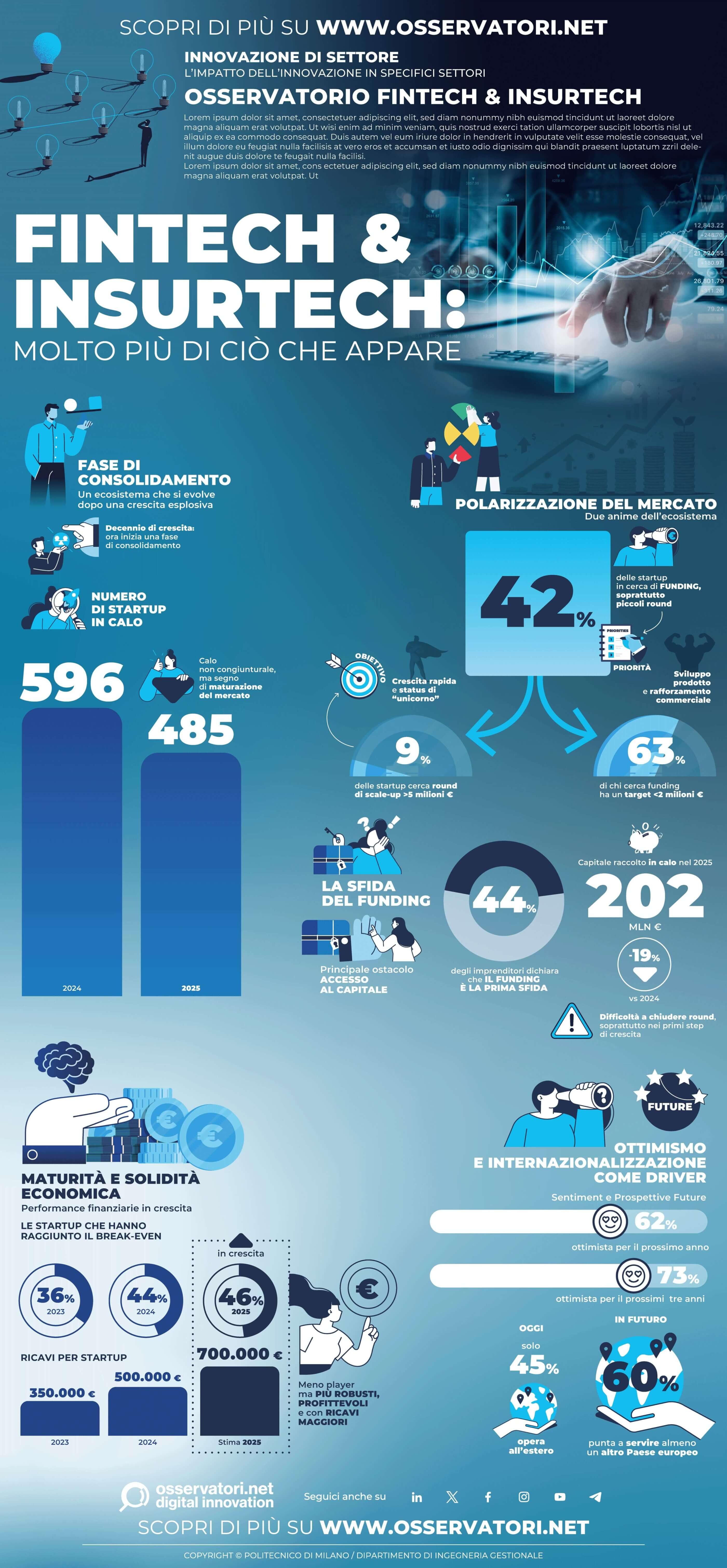 Il settore Fintech & Insurtech italiano nel 2025 mostra un quadro in evoluzione: “485 startup attive”, in calo rispetto alle 596 del 2024, a causa di nuove aperture, chiusure e numerose operazioni di M&A. La raccolta di capitali scende a “202 milioni di euro” (-19%), ma il mercato si rafforza internamente. I ricavi mediano raggiungono “700.000 euro”, in crescita del 29% rispetto al 2024, mentre il 46% delle startup ha già raggiunto il break-even.