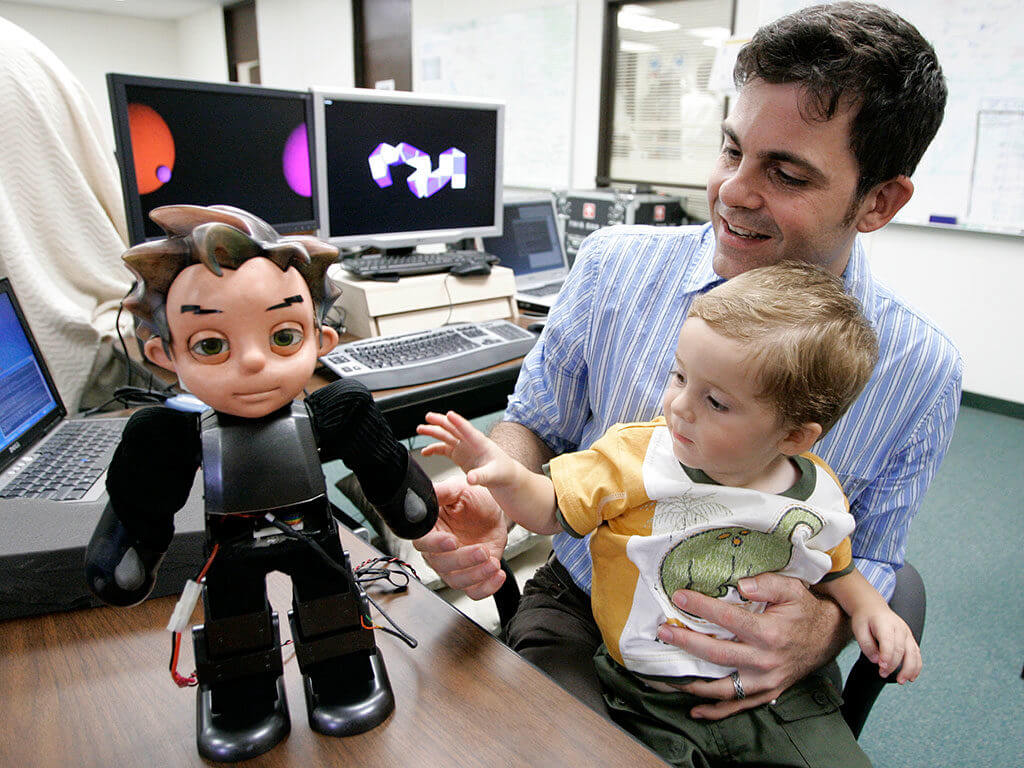 David Hanson tiene in braccio suo figlio che gioca con il robot Zeno