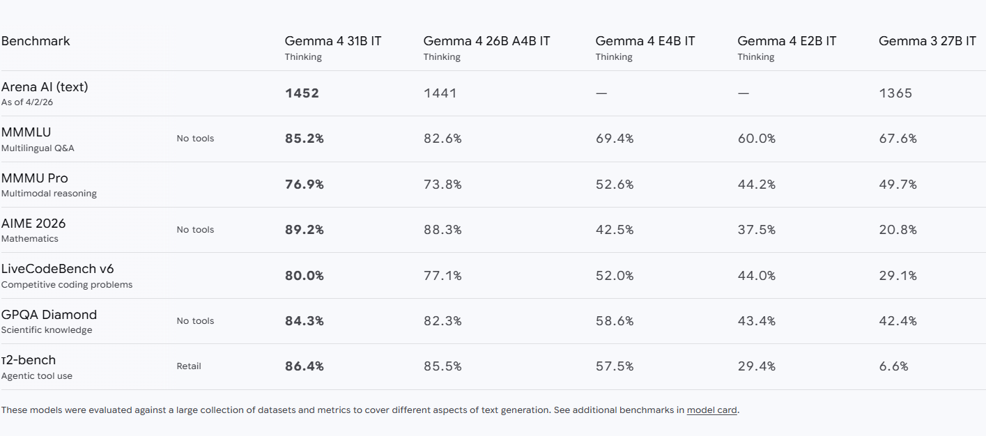 I numeri dicono qualcosa di preciso: il 26B MoE segna 88,3% su AIME 2026, 77,1% su LiveCodeBench, 82,3% su GPQA Diamond.