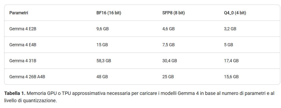 Il 26B MoE usa 128 piccoli esperti, ne attiva 8 più uno condiviso per ogni token, con 3,8 miliardi di parametri in gioco per ogni forward pass. Il risultato è un modello che a 4 bit sta dentro una GPU consumer da 24 GB, una RTX 4090 o una AMD RX 7900 XTX, con framework come Llama.cpp o Ollama.