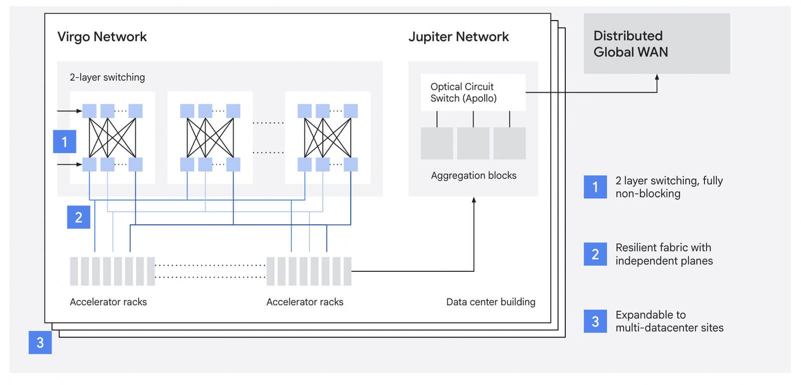 Google introduce anche una nuova rete, chiamata Virgo Network, che permette una scalabilità quasi lineare fino a un milione di chip in un unico cluster logico.