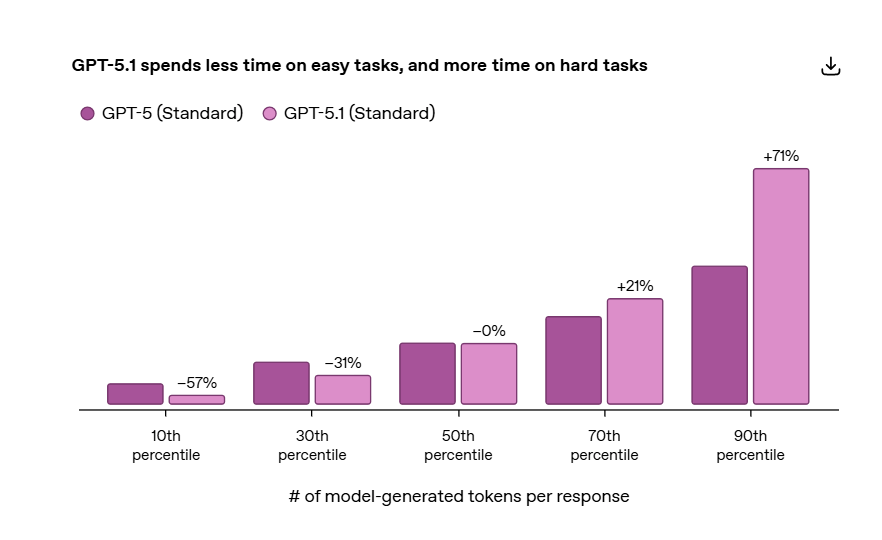 GPT‑5.1 Thinking varia il proprio tempo di elaborazione in modo più dinamico rispetto a GPT‑5 Thinking. Su una distribuzione rappresentativa delle attività di ChatGPT, GPT‑5.1 Thinking è circa due volte più veloce nelle attività più rapide e due volte più lento in quelle più lente. Il tempo di elaborazione è stato impostato su Standard per entrambi i modelli.