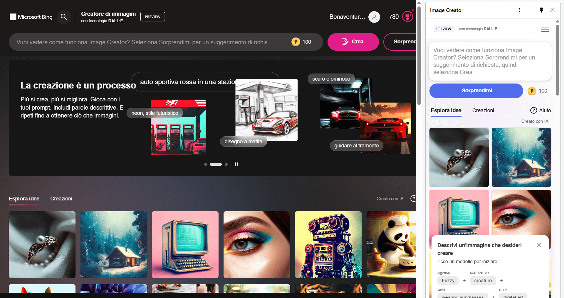 Dopo il primo lancio del chatbot basato sugli stessi modelli di OpenAI usati per ChatGPT, Microsoft ci ha gradualmente abituati all’evoluzione degli strumenti inclusi nel suo Bing, ultimo in ordine di tempo, appunto, Bing Image Creator (in italiano Creatore di Immagini di Bing) il cui funzionamento è basato appunto sul modello Dall-E di OpenAI, azienda in cui Microsoft ha pesantemente investito per potenziare i suoi servizi e strumenti software. Oltre che utilizzarlo direttamente nella pagina del browser usando il link che abbiamo usato sopra, questo strumento è disponibile nel pannello laterale che raccoglie i diversi strumenti presenti nel browser Edge, e fornisce in entrambi i casi quattro immagini basate sul prompt fornito, nel quale possiamo includere anche eventuali ‘stili’ (per esempio ‘qualità fotografica’ o ‘arte digitale’).