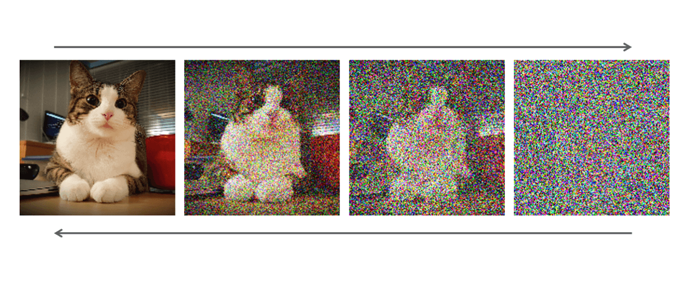 Nello specifico, questa architettura consiste in numerosi strati di neuroni, i quali aggiungono del rumore all’immagine che ricevono in input, rendendola sempre meno chiara. Se gli strati in questo processo di diffusione (chiamato forward diffusion process) fossero infiniti, l’immagine risultante sarebbe rumore puro, ma poiché viene usato un numero limitato di strati, l’immagine risultante è solo un’approssimazione del rumore puro, ancora contenente qualche segnale dell’immagine originale.