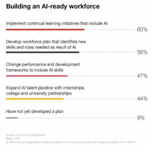 In questo momento, la sfida è quella di riempire posti di lavoro che l’IA richiede: il 31% dei dirigenti è preoccupato per l’incapacità di soddisfare la domanda di competenze IA nei prossimi cinque anni. L’upskilling può creare citizen users e developers, ma probabilmente sarà necessario assumere programmatori altamente qualificati e data scientists, creare partenariati con college o avviare programmi di apprendistato sono un buon punto di partenza. Oltre al reclutamento e all’aggiornamento, è necessario identificare in che modo l’IA sta cambiando i ruoli e le competenze lavorative; evolvere strutture di riqualificazione, performance e compensazione e sviluppare nuovi processi collaborativi.