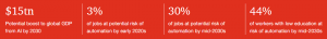 Le stime dell’impatto dell’intelligenza artificiale sui posti di lavoro variano ampiamente, comprese quelle dello studio internazionale sull’automazione dei posti di lavoro di PwC intitolato Will robots really steal our jobs? An international analysis of the potential long term impact of automation in cui sono stati analizzati più di 200 mila lavori in 29 paesi per esplorare i benefici economici e le sfide potenziali poste dall’automazione. Sembra che solo il 3% dei posti di lavoro saranno a rischio potenziale di automazione entro il 2020, ma addirittura il 30% entro la metà degli anni ’30 e il 44% di lavoratori colpiti saranno quelli un basso livello di istruzione.