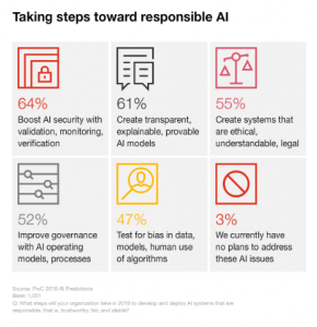 Non sorprende che il 37% dei dirigenti affermi che garantire sistemi di IA affidabili è la principale sfida per il 2019 e che dipende dall’aderenza a 5 aspetti:
