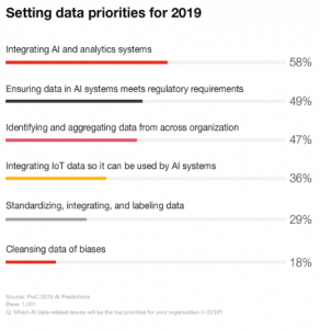 Il problema è che le aziende non stanno fornendo le basi che l’IA necessita per avere successo. Meno di un terzo dei dirigenti afferma che standardizzare, integrare ed etichettare i dati è una priorità per la loro attività nel 2019.
