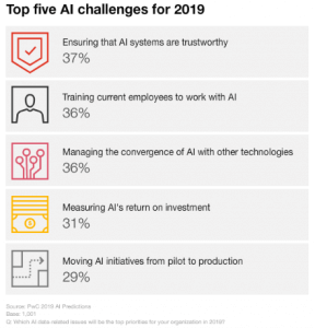 La principale priorità dei dati relativi all’IA per il 2019 è quella di integrare i sistemi di intelligenza artificiale e di analytics per ottenere business insights dai dati. L’intelligenza artificiale può essere utilizzata con dati e analisi per gestire meglio i rischi, aiutare i dipendenti a prendere decisioni migliori, automatizzare le operazioni dei clienti e altro ancora.