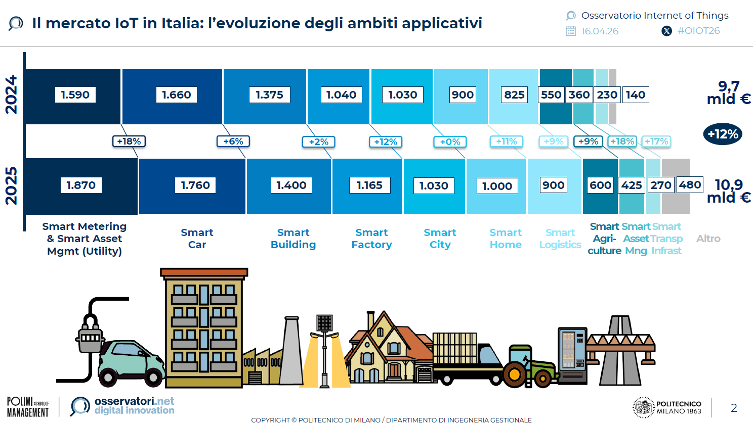 Sopra la soglia del miliardo anche smart factory, smart city e smart home. Il quadro restituisce un ecosistema diffuso, che coinvolge infrastrutture, industria e consumatori.