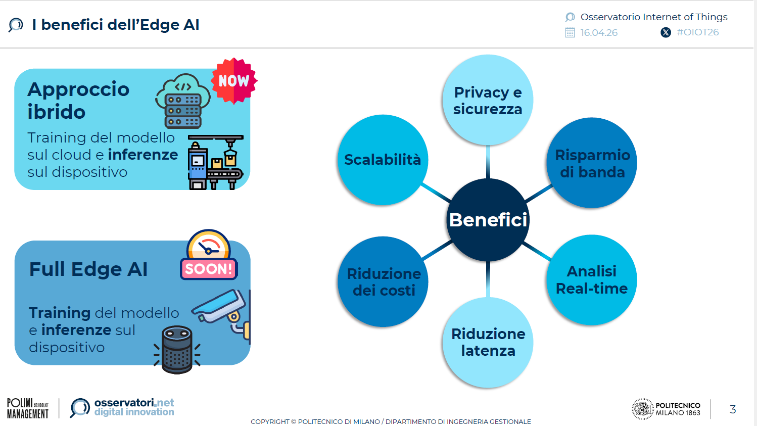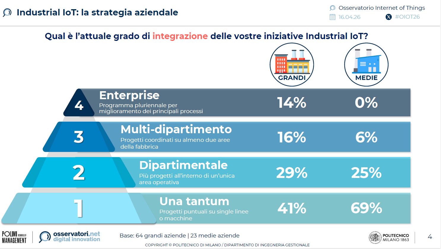 • Integrazione con intelligenza artificiale: 53% grandi e 33% medie prevede progetti IoT/AI entro un anno; servizi IoT 4,5 mld; Industrial IoT e Edge AI abilitano manutenzione predittiva e automazione.
