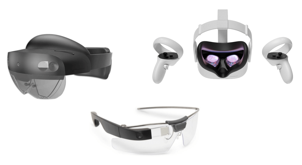Figura 1 : Alcuni visori AR: MIcrosoft Hololens 2, Google Glass 2, Oculus Quest 2 (modalità pass-through)