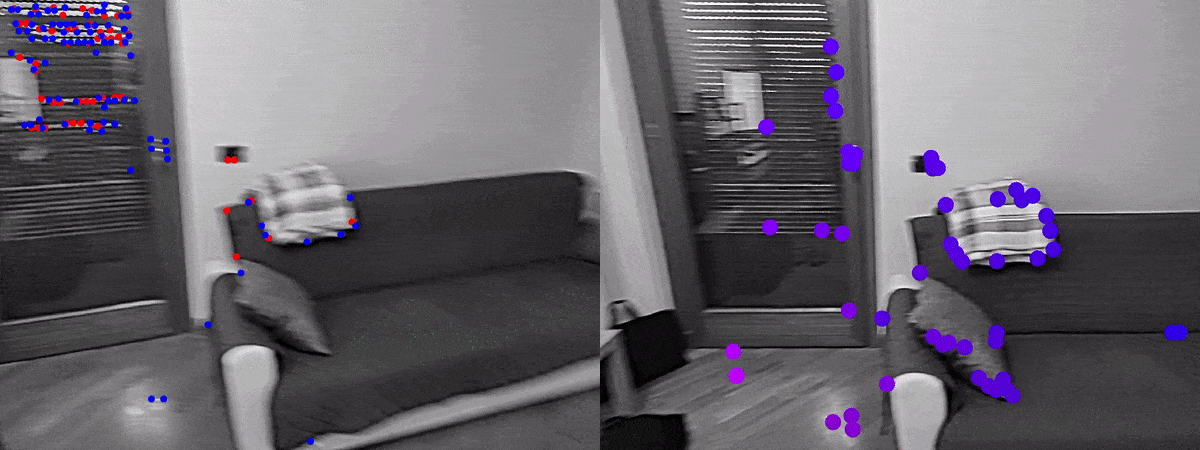 Figura 4: Algoritmi di Computer Vision: a sinistra FAST Feature Detection, a destra tracking delle Feature durante il movimento ad opera dell’algoritmo KLT Pyramid. Il secondo permette di costruire il sistema di riferimento fisico per gli oggetti virtuali. (Autore: Giovanni Nardini)