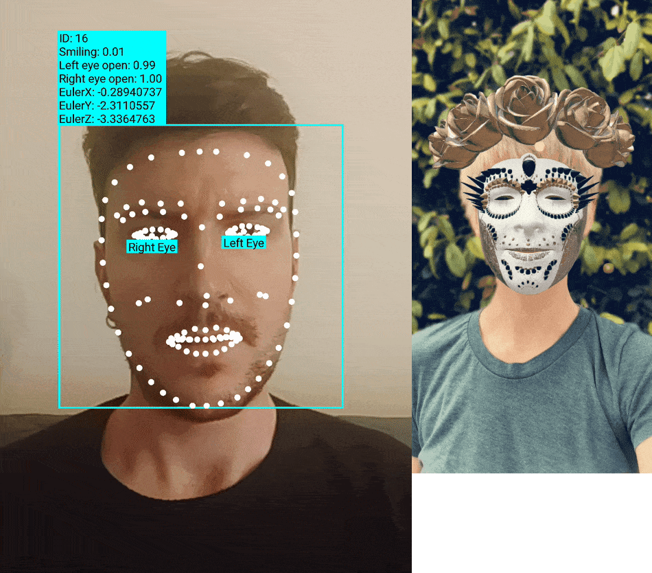 Figura 6: Modelli AI di Facial Landmarks Extraction. A sinistra output del modello (MLKit-Vision), a destra rendering AR su mesh (Snapchat)