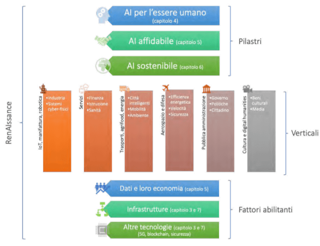 Il documento italiano è strategico ma anche molto operativo: definisce tre pilastri su cui costruire lo sviluppo delle tecnologie di AI per creare una nuova “RenaAIssance” e definisce gli obiettivi da raggiungere. Partendo poi dalle specificità e dalle problematiche del nostro Paese individua sei verticali che caratterizzano il nostro tessuto economico, culturale e industriale su cui focalizzare gli investimenti, delineando alcuni fattori abilitanti che devono essere sviluppati insieme alle tecnologie AI per la realizzazione del piano strategico. Infine la strategia propone 82 raccomandazioni e una prima bozza di budget per partire subito con l’esecuzione del piano e non perdere le grandi opportunità offerte da questa nuova rivoluzione industriale e culturale.
