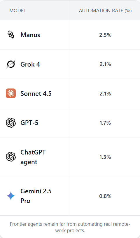 Il risultato è netto: il miglior sistema ha completato con successo solo il 2,5% dei progetti. “I modelli attuali non sono nemmeno lontanamente in grado di automatizzare i veri lavori dell’economia”, ha spiegato Jason Hausenloy, uno degli autori dello studio.