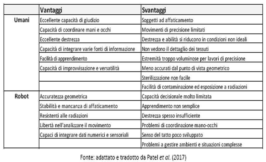 Di seguito una tabella in cui sono elencati i punti di forza e debolezza rispettivamente di umani e robot: