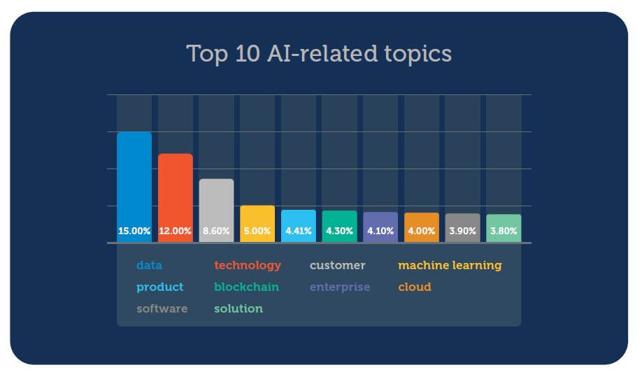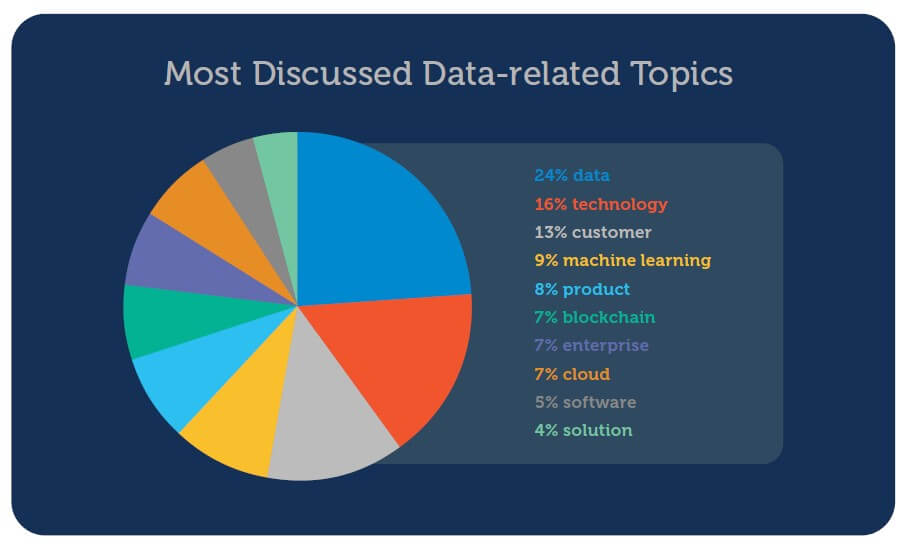 I dati sono stati l’argomento più discusso (15%) nel campione di articoli, seguiti da tecnologia (12%), cliente (8,6%), apprendimento automatico (5%) e prodotto (4,41%).