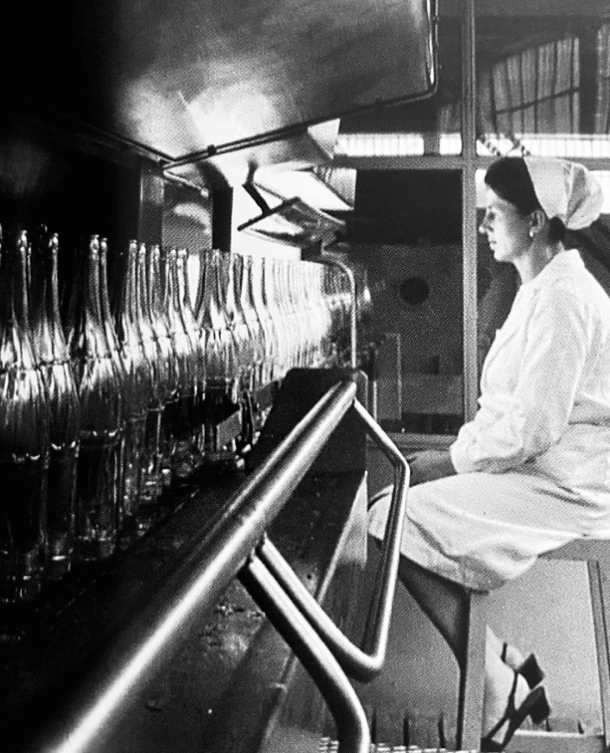 Controllo qualità di bottiglie di vetro, foto tratta da: Gli uomini, il lavoro, la fabbrica – Niccolò Biddau (Stamperia Artistica Nazionale Editrice), 2005