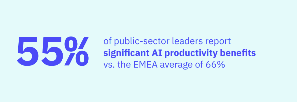 Anche le organizzazioni del settore pubblico si trovano nelle fasi iniziali del processo di conversione del potenziale dell’AI in valore operativo. Ad oggi, soltanto il 55% delle organizzazioni del settore pubblico ha dichiarato di aver ottenuto miglioramenti significativi di produttività.