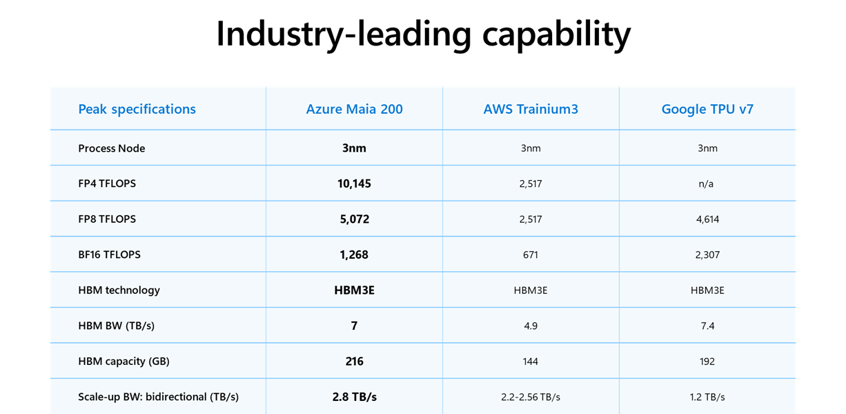 Realizzato con processo produttivo TSMC a 3 nanometri, Maia 200 integra core tensoriali FP8 e FP4 nativi, un sistema di memoria ridisegnato con 216 GB di HBM3e a 7 TB/s e 272 MB di SRAM on-chip. Secondo Microsoft, il chip offre tre volte le prestazioni FP4 del Trainium di terza generazione di Amazon e supera la settima generazione di TPU di Google in FP8, garantendo un miglioramento del 30% nel rapporto prestazioni/prezzo rispetto alle soluzioni precedenti.